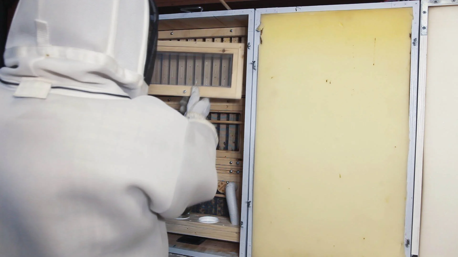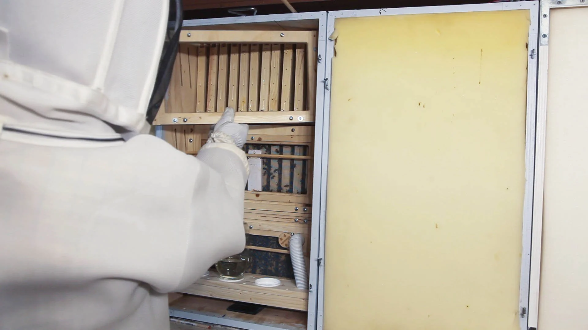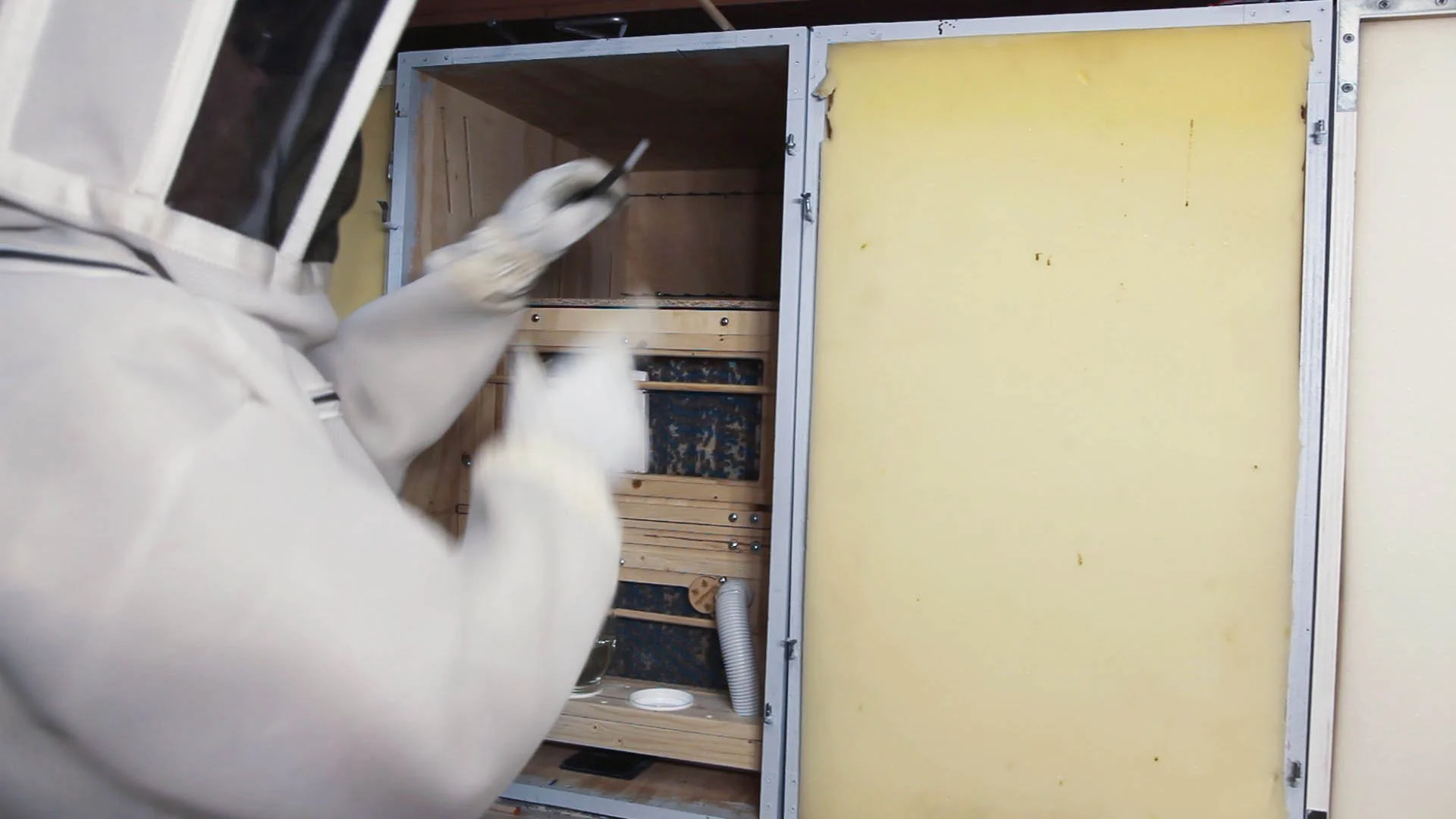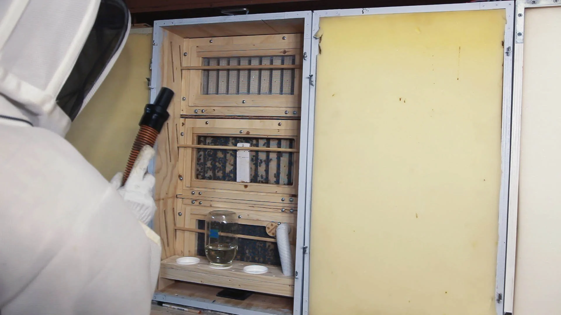 Only a couple bees leave the hive into the beehouse, so I use my bee vacuum and sweep them up. Later they will be added to the landing bord.